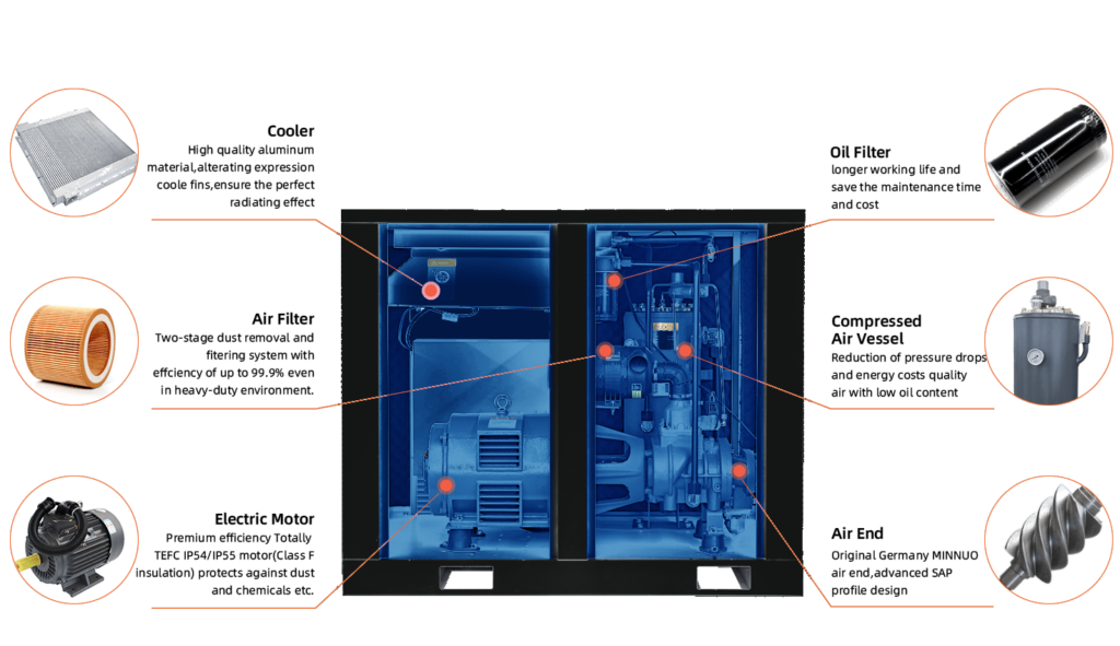 Schraubenkompressoren nutzen einen Verdrängungsmechanismus mit zwei ineinander greifenden Schrauben. Bei dem am weitesten verbreiteten ölüberfluteten System füllt ein Öl auf Schmierstoffbasis den Raum zwischen den spiralförmigen Rotoren. Dieses Öl dient als hydraulische Dichtung, die den Austritt von Luft verhindert und mechanische Energie überträgt. Wenn atmosphärische Luft in den Kompressor eintritt, wird sie von den rotierenden Schrauben verdichtet und unter Druck an Ihre Anwendung geliefert. Keepwin Compressor hat sich auf die Herstellung einer umfassenden Palette von Schraubenkompressoren für den industriellen Einsatz spezialisiert, die den spezifischen Anforderungen Ihres Unternehmens gerecht werden.