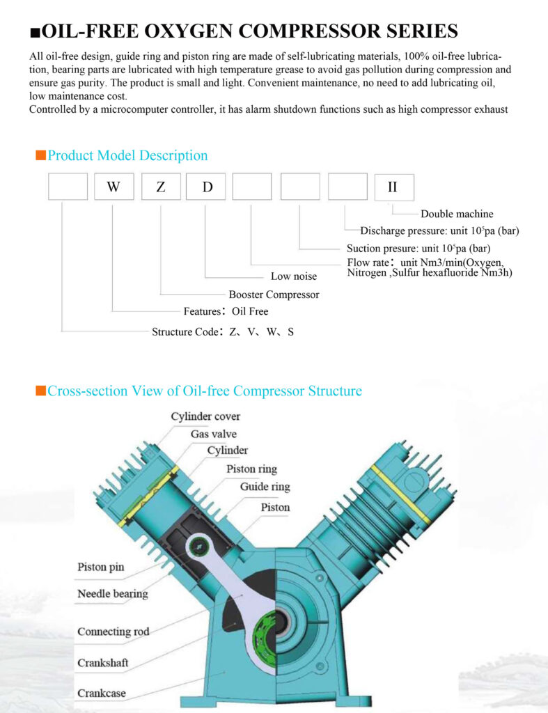 • 无油压缩机用于压缩医用氧气并将其装入气瓶,确保医院、诊所和家庭氧疗所需氧气的纯度。